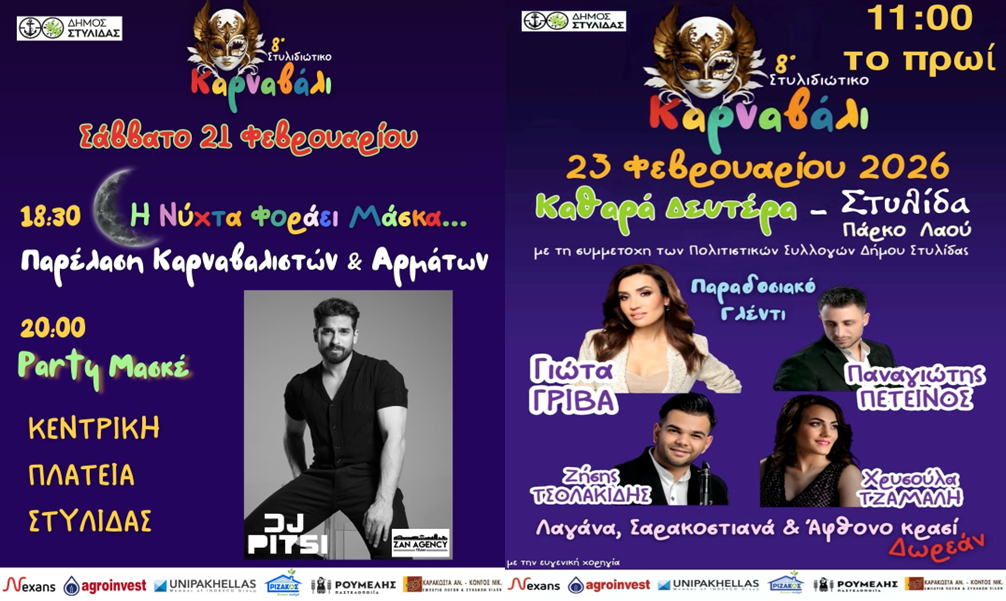 Ο Δήμος Στυλίδας διοργανώνει το 8ο Καρναβάλι Στυλίδας, με αποκριάτικες εκδηλώσεις που θα πραγματοποιηθούν το Σάββατο 21, την Κυριακή 22 και την Καθαρά Δευτέρα 23 Φεβρουαρίου 2026.