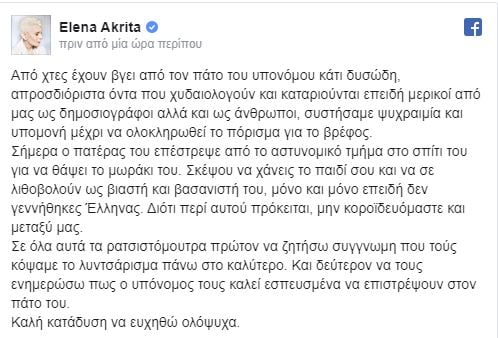 ΗΈλενα Ακρίτα με ανάρτησή της στο λογαριασμό που διατηρεί στο Facebook τοποθετήθηκε για την υπόθεση του νεκρού βρέφους από τη Συρία που μεταφέρθηκε στο νοσοκομείο Αγλαΐα Κυριακού.