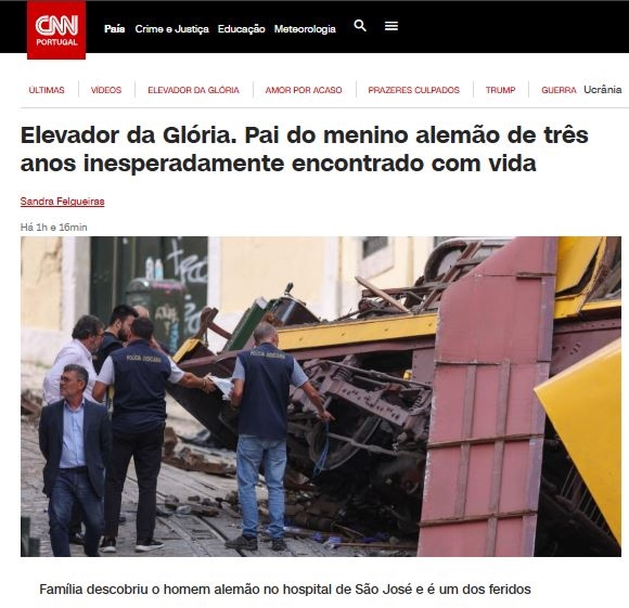 Πορτογαλικά ΜΜΕ είχαν μεταδώσει εχθές, Πέμπτη, 04/09, ότι το 3χρονο αγοράκι που ανασύρθηκε από τα συντρίμμια του τελεφερίκ είχε δει τον πατέρα του νεκρό και τη μητέρα του παγιδευμένη με σπασμένη σπονδυλική στήλη. Το παιδί βρίσκεται μαζί με τη 45χρονη μητέρα του, η οποία νοσηλεύεται σε σοβαρά αλλά σταθερή κατάσταση. Μητέρα και παιδί βρίσκονται σε άλλο νοσοκομείο από τον πατέρα. Η 45χρονη και το 3χρονο αγοράκι είναι στο νοσοκομείο Santa Maria της Λισαβόνας.