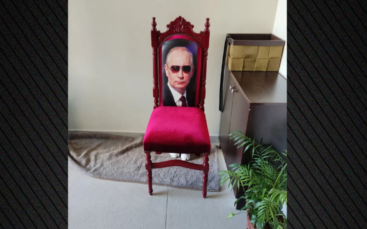 1) Σε μία καρέκλα, η οποία ευρέθη στην κατοικία μου και στην οποία απεικονίζεται ο Πρόεδρος της Ρωσίας, Βλαντίμιρ Πουτίν.
