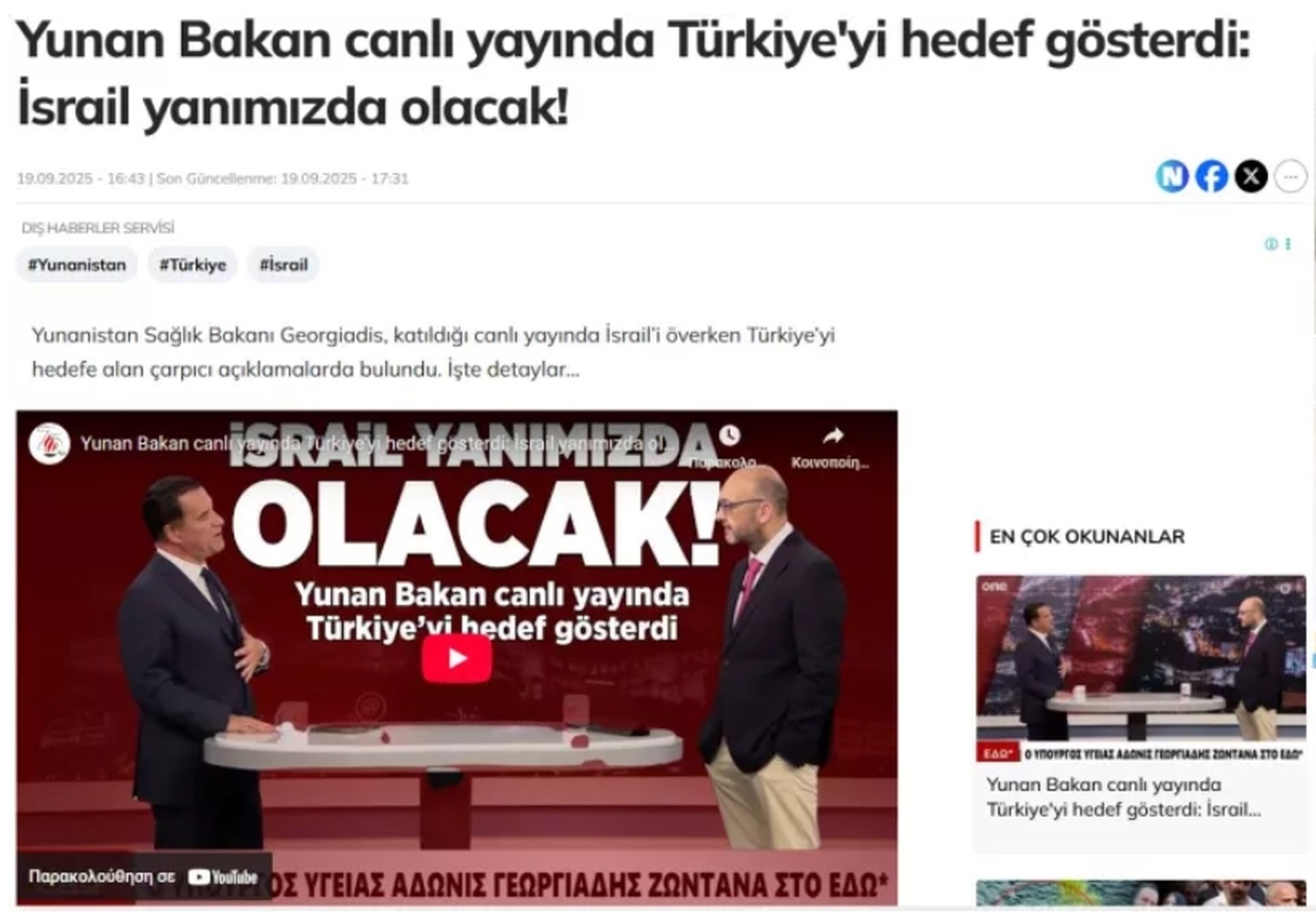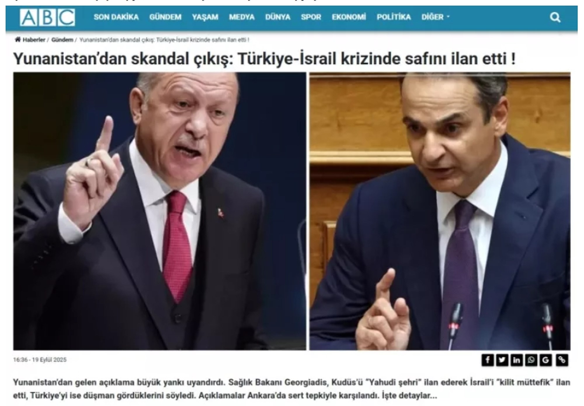 Η δήλωση του Έλληνα υπουργού προκάλεσε σημαντική αναταραχή αναφέρει επίσης το ABC gazetesi και επισημαίνει ότι ο υπουργός Υγείας Γεωργιάδης χαρακτήρισε την Ιερουσαλήμ “εβραϊκή πόλη”, το Ισραήλ “βασικό σύμμαχο” και την Τουρκία εχθρό.
