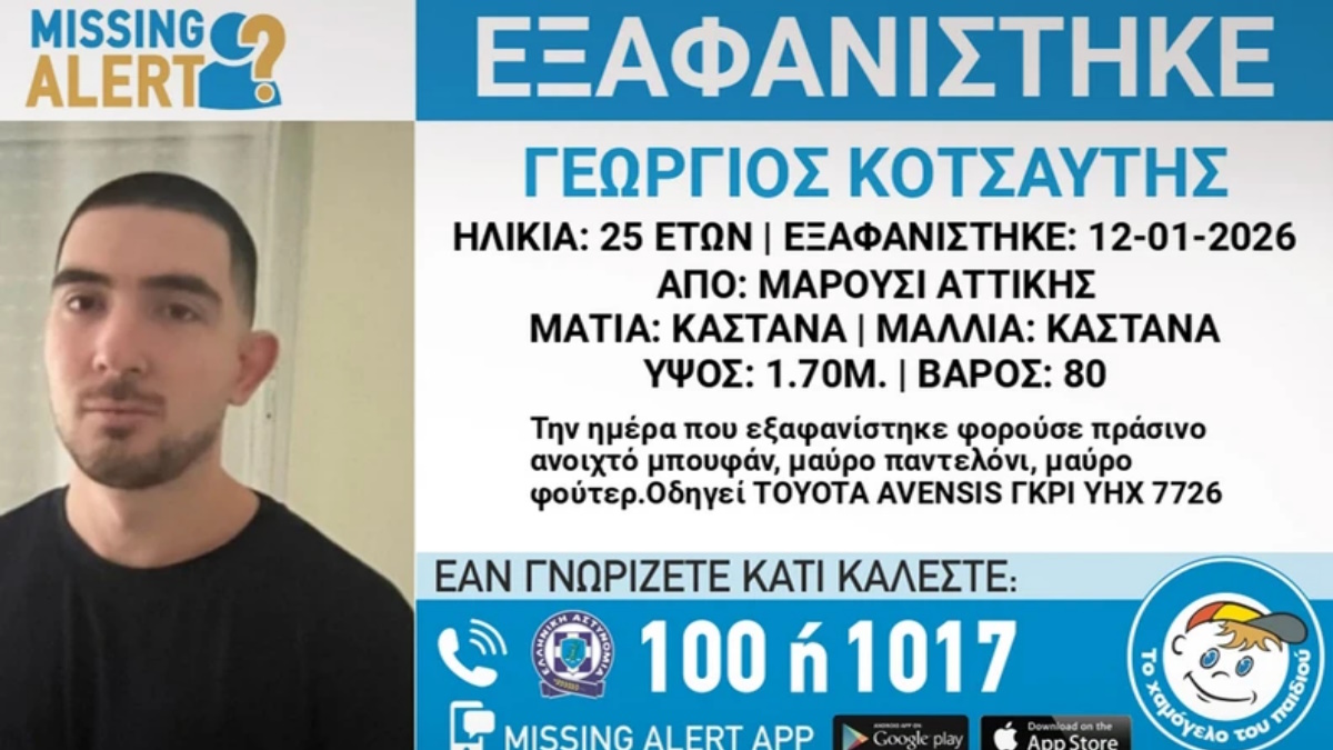 Συναγερμός έχει σημάνει στις Αρχές και στην οικογένεια του 25χρονου Γεώργιου Κοτσαύτη που εξαφανίστηκε από το Μαρούσι Αττικής στις 12 Ιανουαρίου 2026.