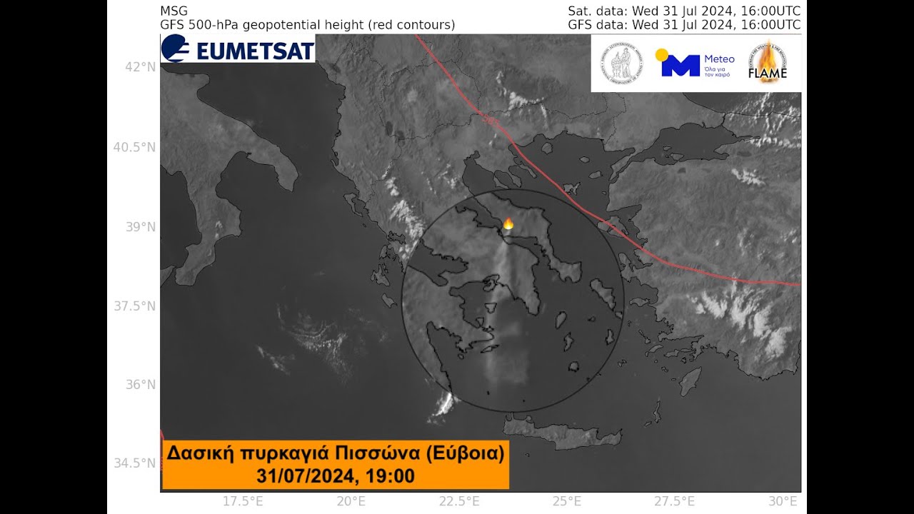 Όπως φαίνεται μέσα από τη δορυφορική εικόνα της EUMETSAT ο πυκνός καπνός αργά το απόγευμα (19:00) της Τετάρτης 31 Ιουλίου 2024 είχε ήδη μεταφερθεί πάνω από το Μυρτώο Πέλαγος, διανύοντας απόσταση μεγαλύτερη των 150 km.