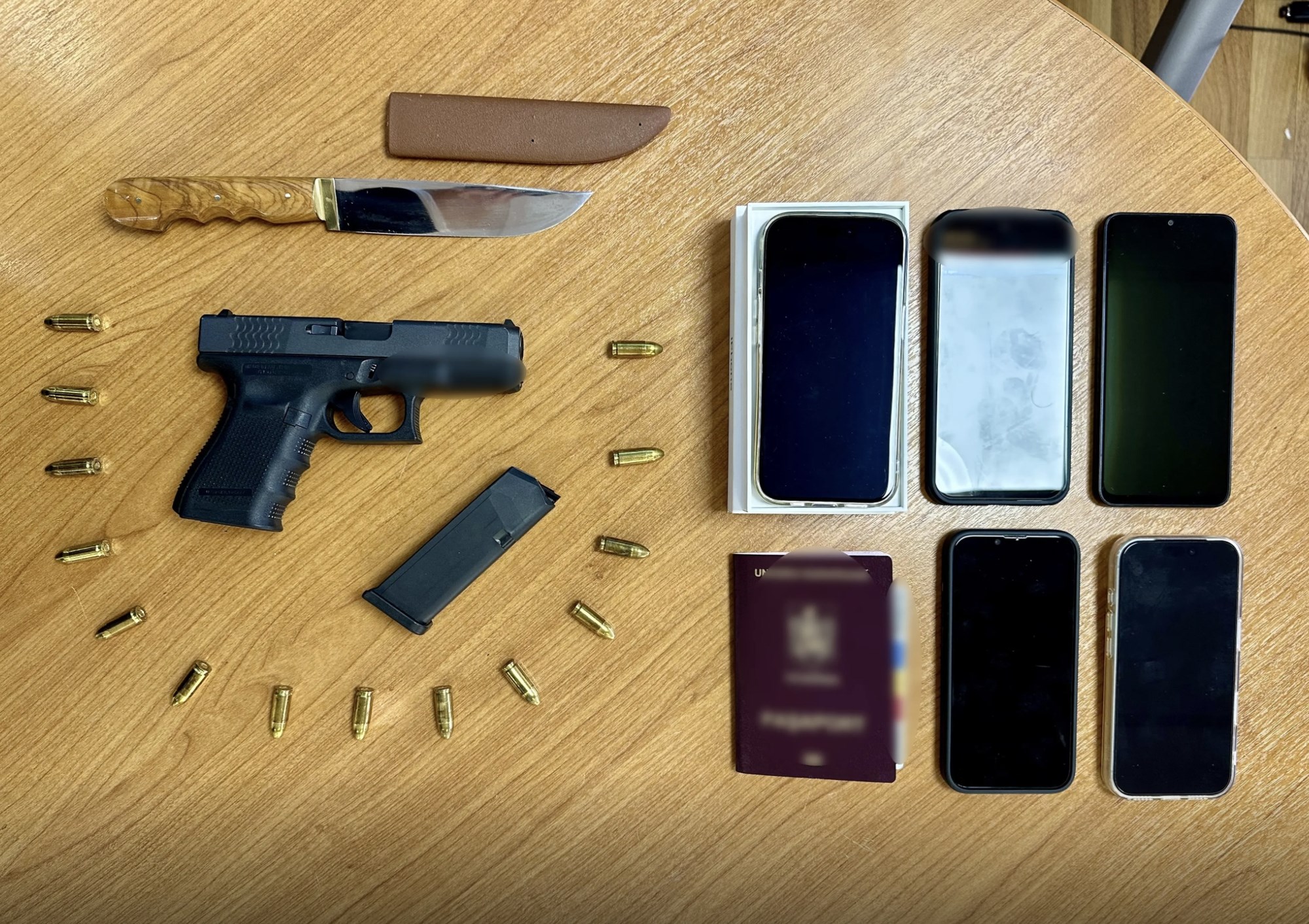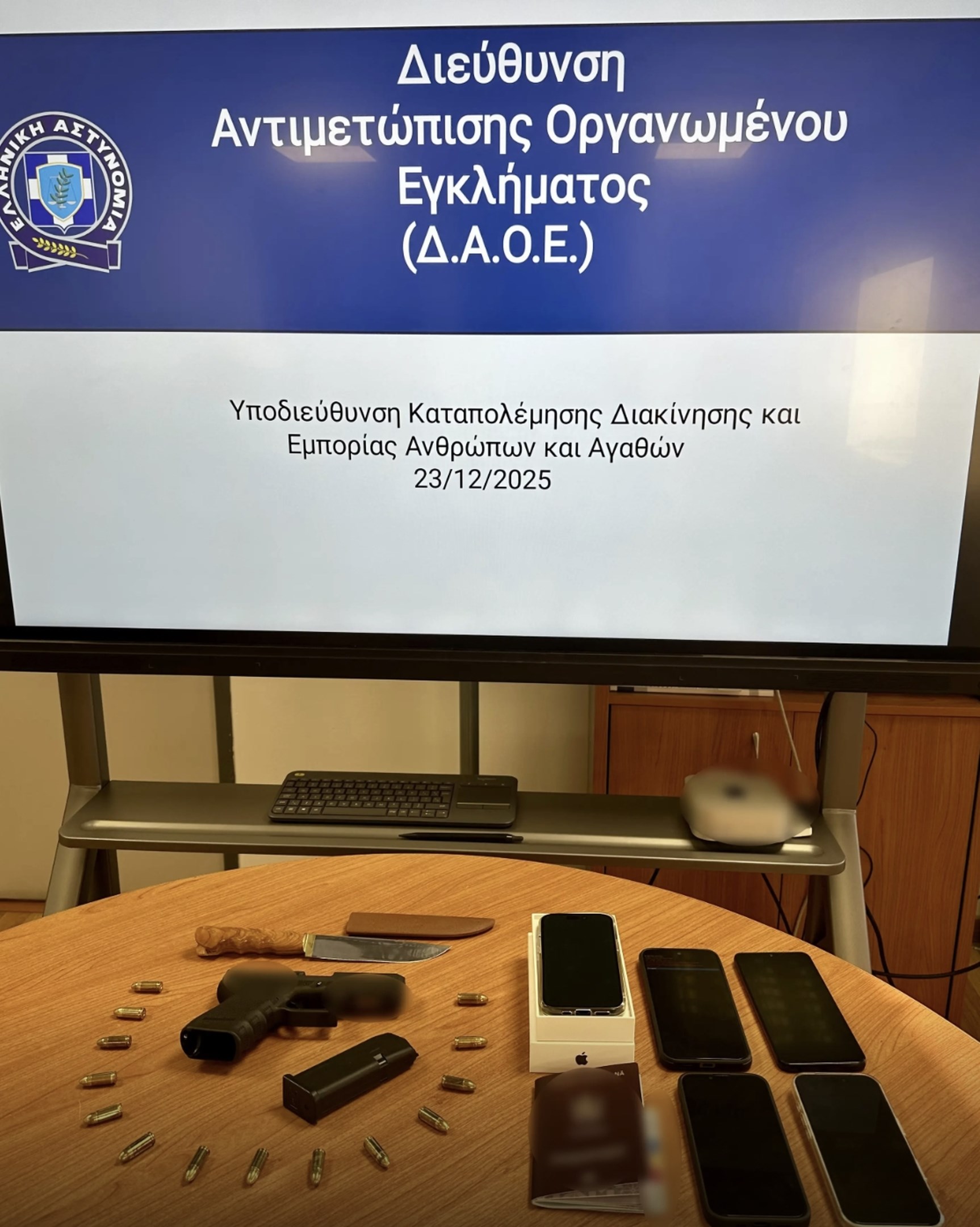 Στην έρευνα που έγινε στο σπίτι στη Καλύβια, βρέθηκαν και κατασχέθηκαν: πιστόλι, γεμιστήρας με 14 φυσίγγια, διαβατήριο και δελτίο ταυτότητας αμφιβόλου γνησιότητας, άδεια ικανότητας οδήγησης, τραπεζική κάρτα σε στοιχεία τρίτου ατόμου, ένα μαχαίρι και πέντε κινητά τηλέφωνα.