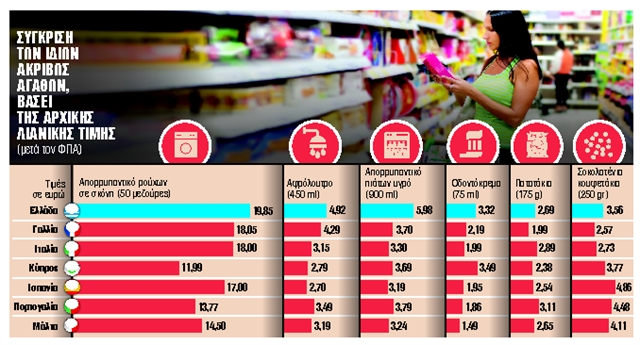 Για παράδειγμα, η τιμή ενός πολύ γνωστού απορρυπαντικού ρούχων σε σκόνη (50 μεζούρες) είναι 19,85 ευρώ, όταν στη Γαλλία είναι 18,05 ευρώ, στην Ιταλία 18, στην Ισπανία 17, στην Κύπρο 11,99, στην Πορτογαλία 13,77 και στη Μάλτα 14,50 ευρώ.