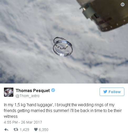 Ο αστροναύτης Τόμας Πισκέ αποκάλυψε πως έχει μαζί του στο διάστημα, τις βέρες του ζευγαριού που είναιn να παντρέψει το καλοκαίρι.