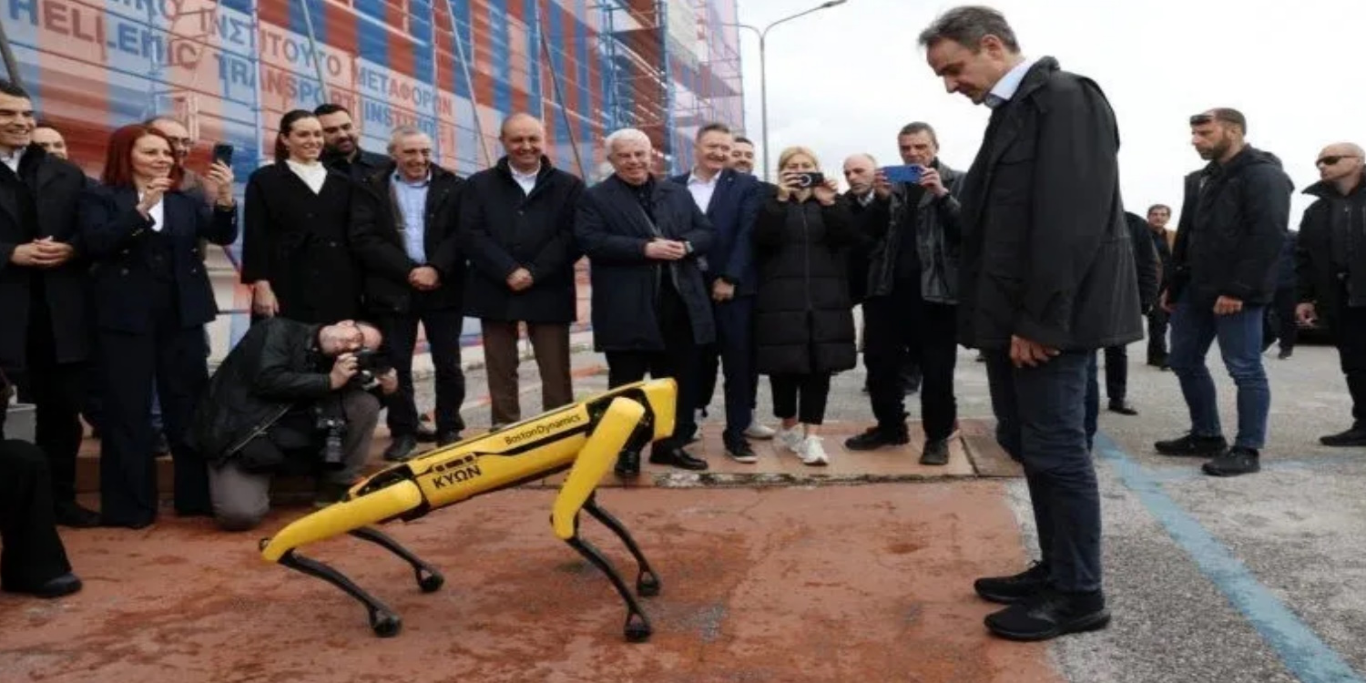 Τον κ. Μητσοτάκη υποδέχθηκαν οι υπεύθυνοι του ΕΚΕΤΑ και του ΙΜΕΤ στην είσοδο του Ινστιτούτου, με μια επίδειξη από τον ρομποτικό σκύλο ΚΥΩΝ.