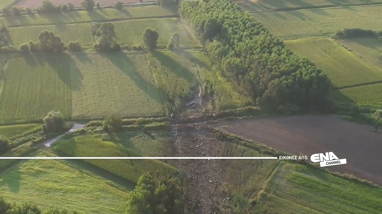 Βίντεο drone δείχνει το σημείο της πτώσης του αεροσκάφους, όπου έχει σχηματιστεί ένα μεγάλο μαύρο σημείο.
