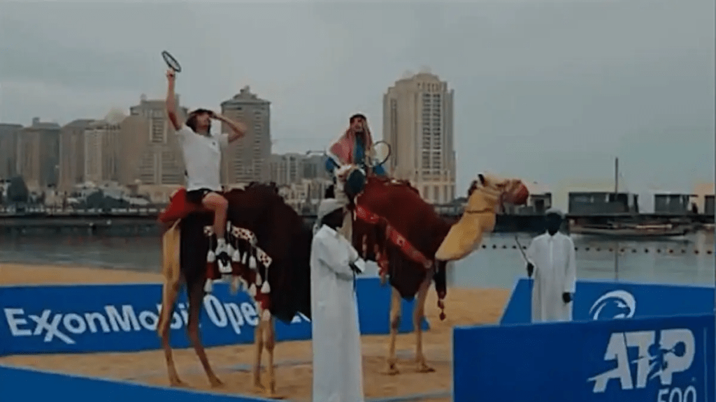Ο Στέφανος Τσιτσιπάς, ο Νόβακ Τζόκοβιτς, ο Κάρλος Αλκαράθ και ο Γκριγκόρ Ντιμιτρόφ έπαιξαν τένις πάνω σε… καμήλες, θέλοντας να προωθήσουν με ένα φοβερό τρόπο το τουρνουά του Κατάρ.