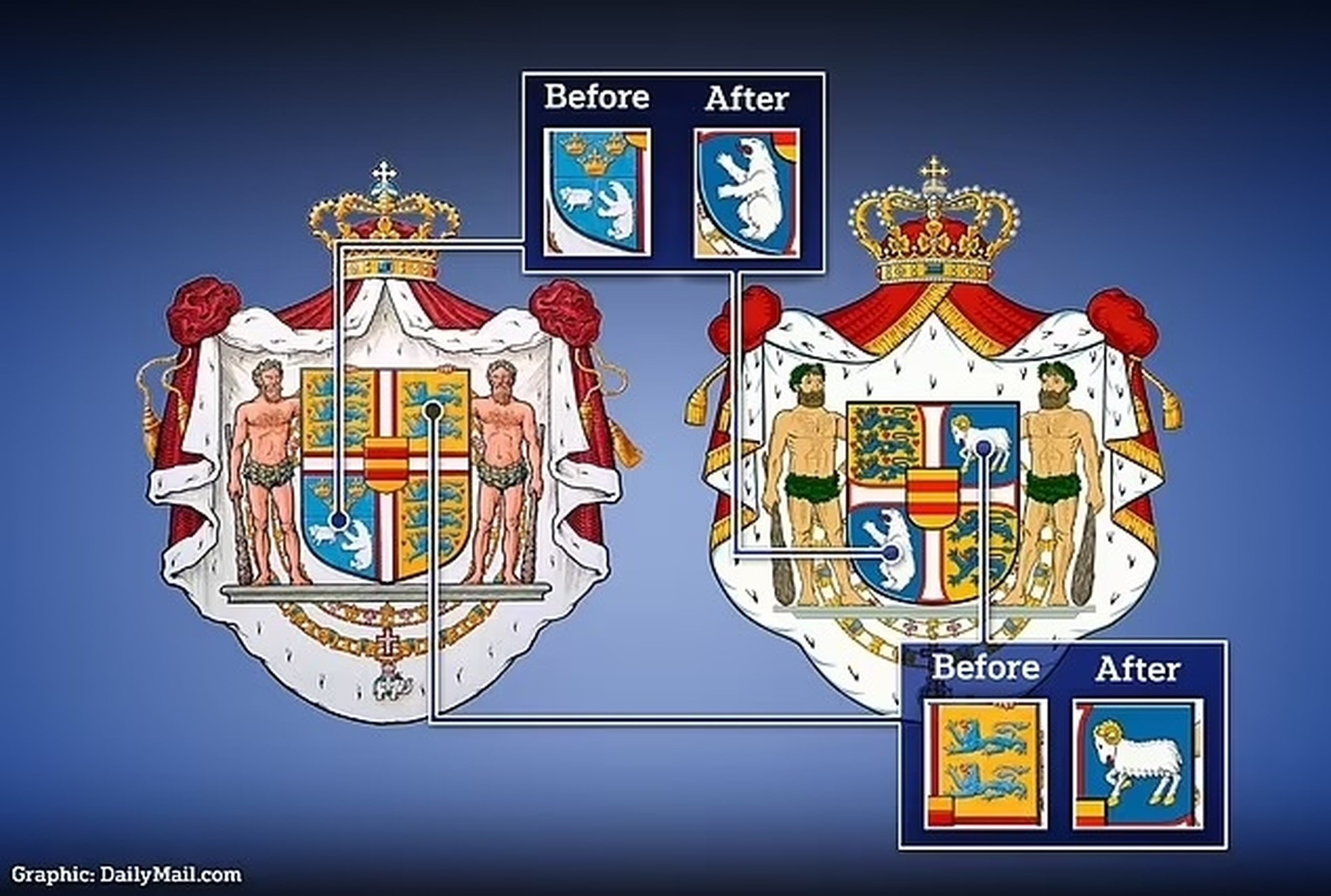 Εδώ και 500 χρόνια, τα προηγούμενα βασιλικά οικόσημα της Δανίας περιείχαν τρία στέμματα, το σύμβολο της Ένωσης του Κάλμαρ μεταξύ Δανίας, Νορβηγίας και Σουηδίας, της οποίας ηγούνταν η Δανία μεταξύ 1397 και 1523. Αποτελούν επίσης σημαντικό σύμβολο της γειτονικής της Σουηδίας. Όμως στην ενημερωμένη έκδοση, οι κορώνες έχουν αφαιρεθεί και αντικατασταθεί με μια πιο μεγάλη πολική αρκούδα και ένα μεγαλύτερο, σε σύγκριση με πριν, κριάρι για να συμβολίζουν τη Γροιλανδία και τα Νησιά Φερόες, αντίστοιχα.