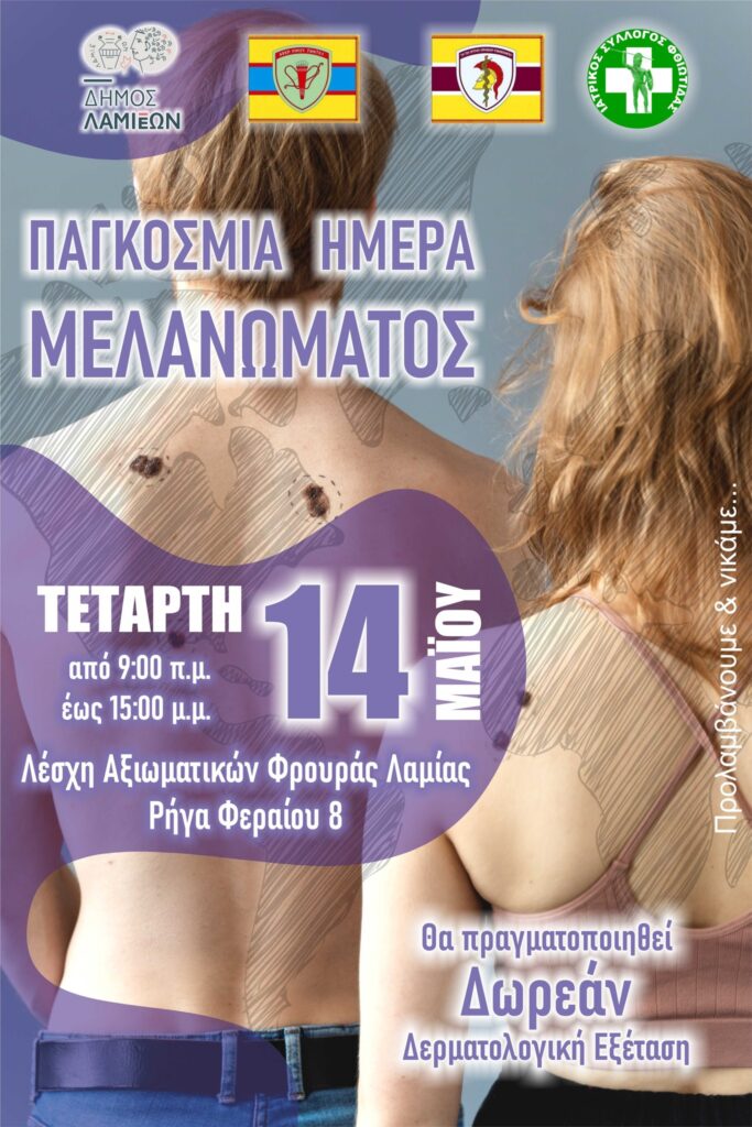 Ο Δήμος Λαμιέων , σε συνεργασία με το Κέντρο Εκπαίδευσης Υλικού Πολέμου (ΚΕΥΠ), τη Διεύθυνση Υγειονομικού του ΓΕΣ και τον Ιατρικό Σύλλογο Φθιώτιδας, διοργανώνει για δεύτερη συνεχή χρονιά δράση ενημέρωσης και πρόληψης με αφορμή την Παγκόσμια Ημέρα Μελανώματος.