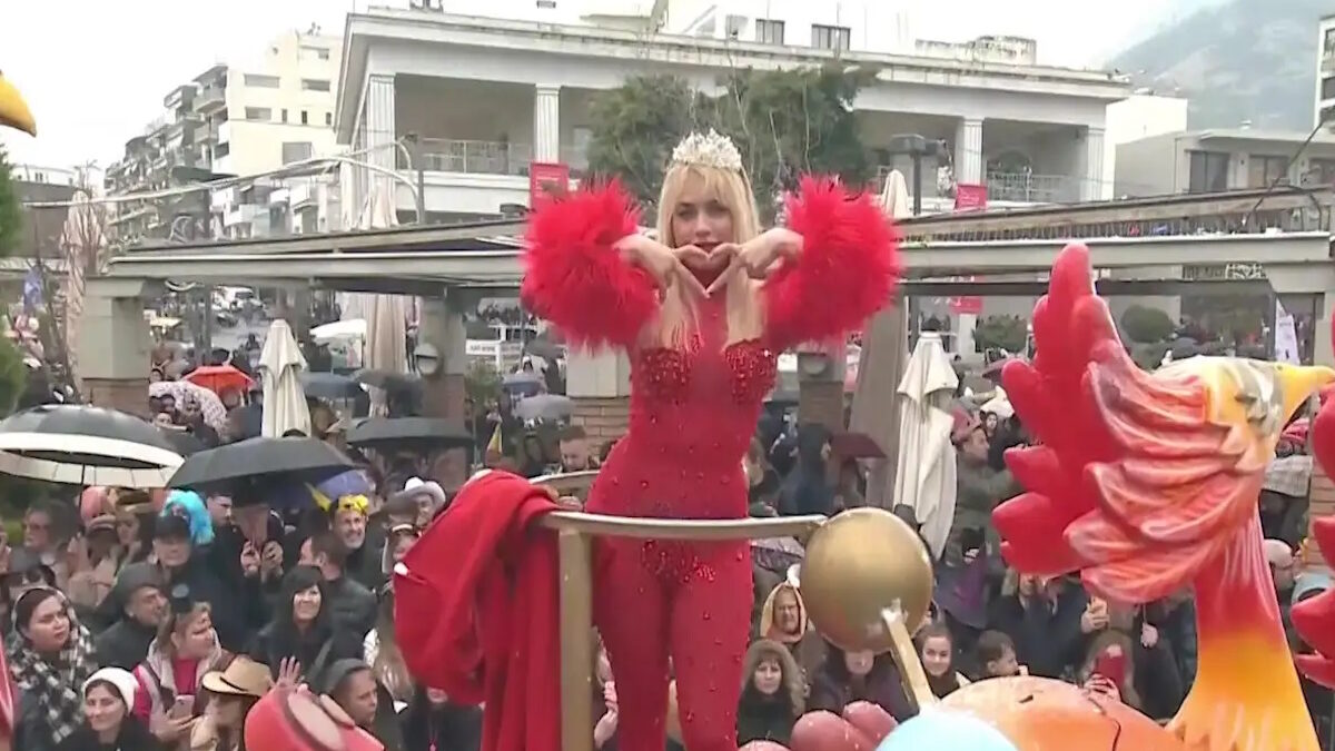 Ανάμεσα στα άρματα ξεχωρίζει το άνθινο άρμα με τη «βασίλισσα», Ελένη Μπάδα, που βρίσκεται μέσα σε 30.000 γαρύφαλλα.