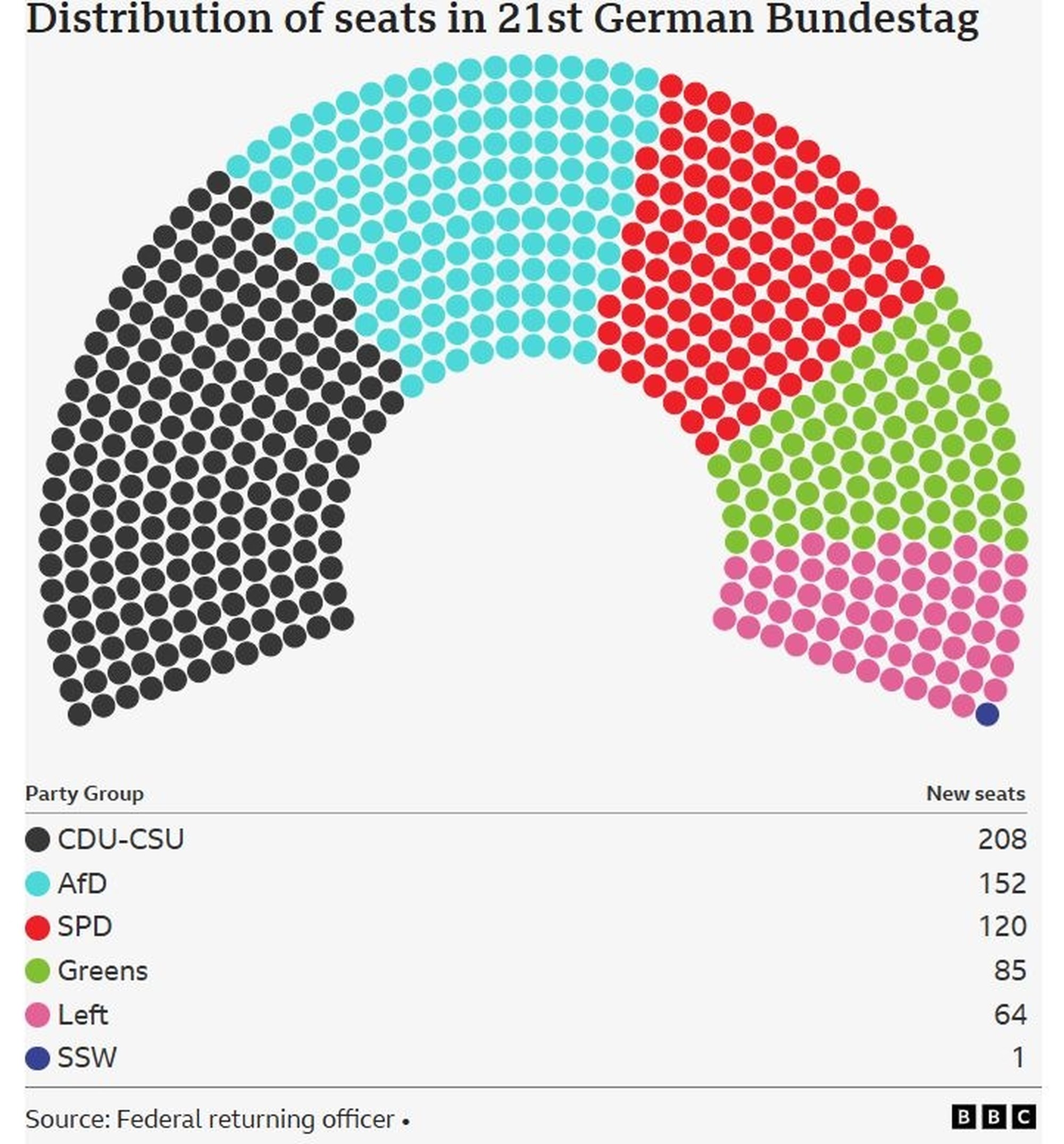 Σημειώνεται ότι ο συνασπισμός των Χριστιανοδημοκρατών/Χριστιανοκοινωνιστών και Σοσιαλδημοκρατών μετρά συνολικά 328 βουλευτές (308 για το CDU/CSU και 120 για το SPD).