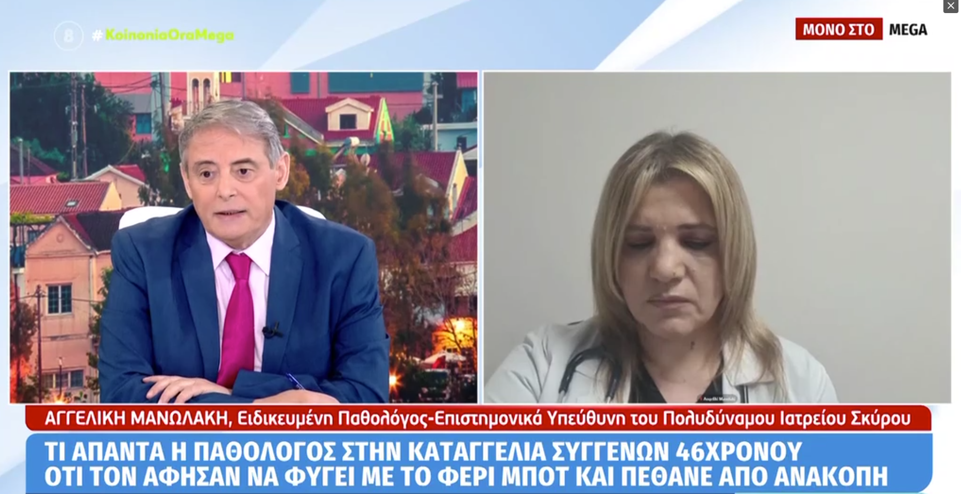 Η Αγγελική Μανωλάκη, παθολόγος και επιστημονικά υπεύθυνη του Πολυδύναμου Ιατρείου Σκύρου, μίλησε στην εκπομπή «Κοινωνία Ώρα Mega» και αφού εξέφρασε τα συλλυπητήριά της στους οικείους του θανόντος, μετέφερε όσα συνέβησαν κατά την άφιξη του 46χρονου στο ιατρείο.