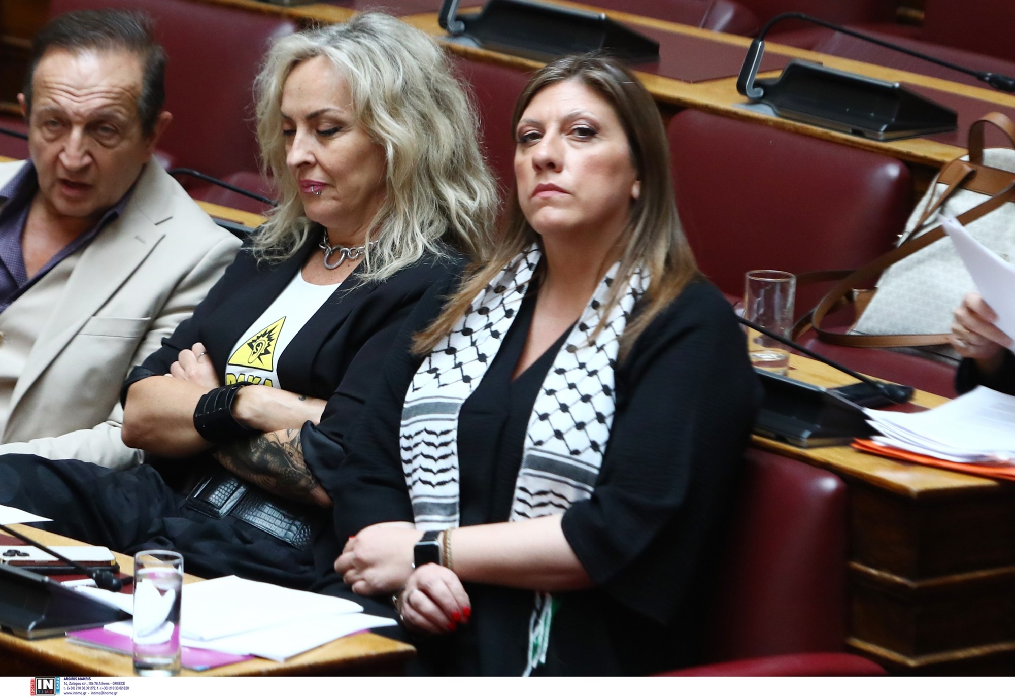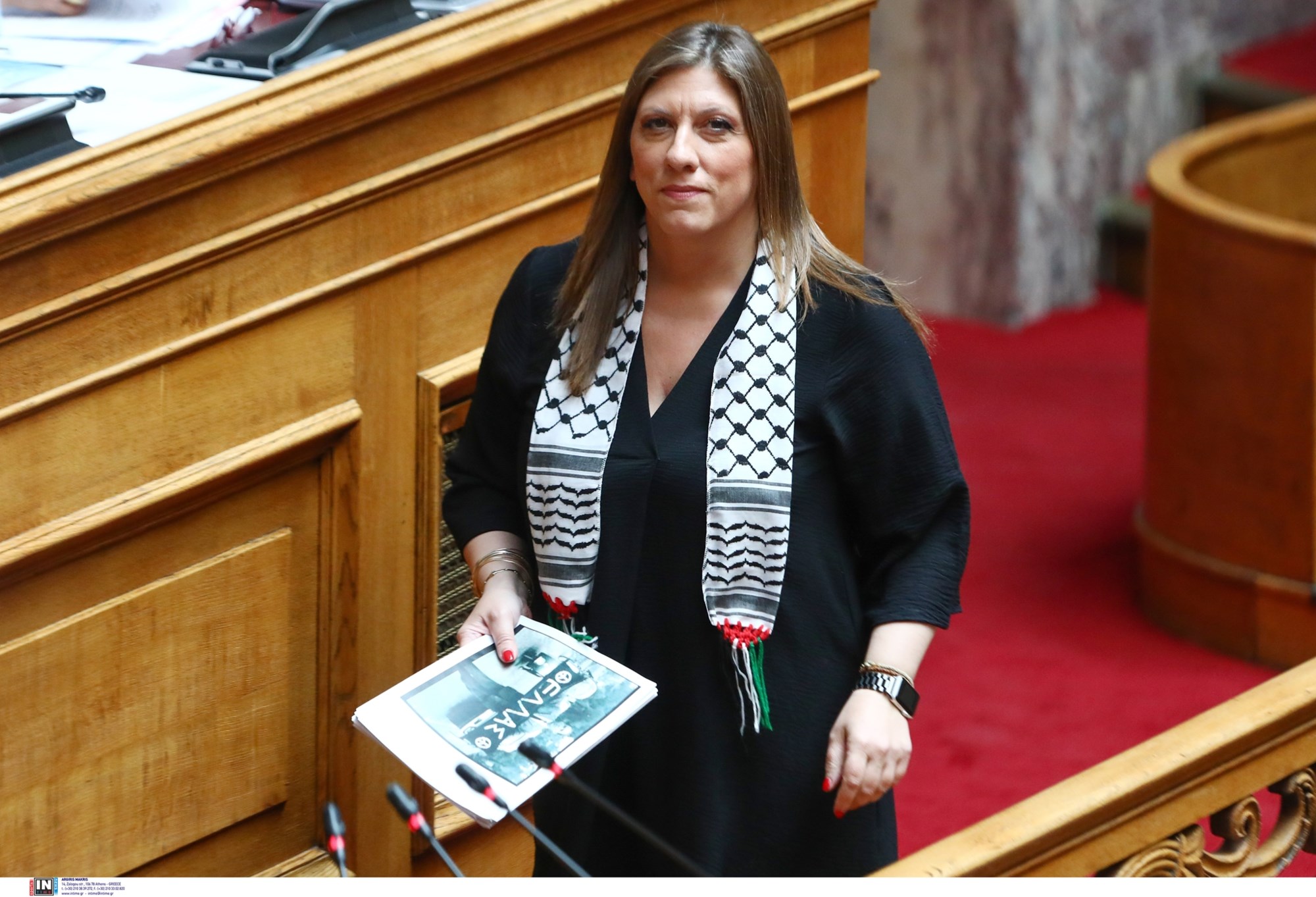 Με μια μαντήλα της Παλαιστίνης στον λαιμό, εμφανίστηκε η πρόεδρος της Πλεύσης Ελευθερίας, Ζωή Κωνσταντοπούλου, στην Ολομέλεια της Βουλής, καθώς ήταν προγραμματισμένη μια ειδική συνεδρίαση στη μνήμη του Γρηγόρη Λαμπράκη.