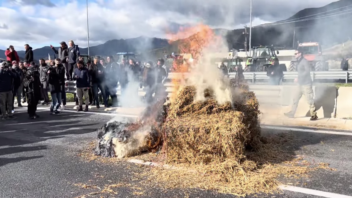 Οι αγρότες έχοντας μεταφέρει άχυρα με στις καρότσες των οχημάτων τους, τα πέταξαν στον αυτοκινητόδρομο και τα έκαψαν ως ένδειξη διαμαρτυρίας.