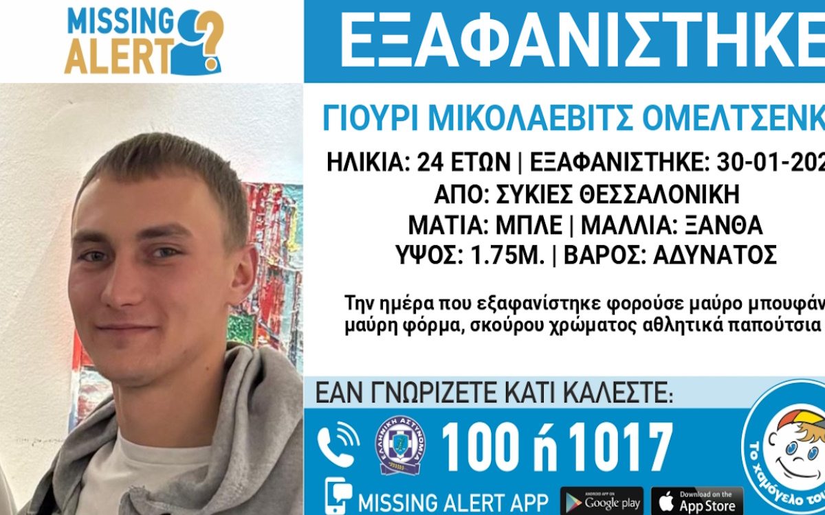 Ένας 24χρονος εξαφανίστηκε το απόγετμα της Πέμπτης 30/1 από τη Θεσσαλονίκη, αναφέρει το Χαμόγελο του Παιδιού που εξέδωσε σχετική ανακοίνωσης,