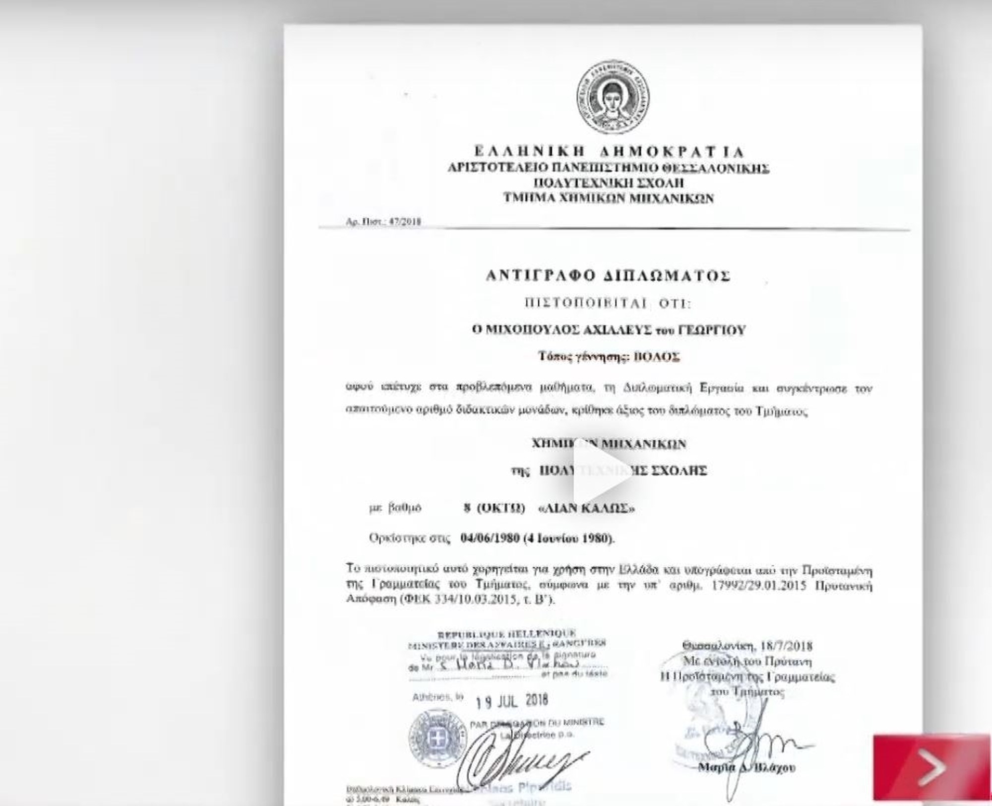 – Το πτυχίο από το Αριστοτέλειο Πανεπιστήμιο Θεσσαλονίκης, από την σχολή χημικών Μηχανικών του Νικόλαου Κάρναβου, ο οποίος αποδομεί με τις μελέτες του, ότι η πυρόσφαιρα προέρχεται από τα έλαια σιλικόνης.