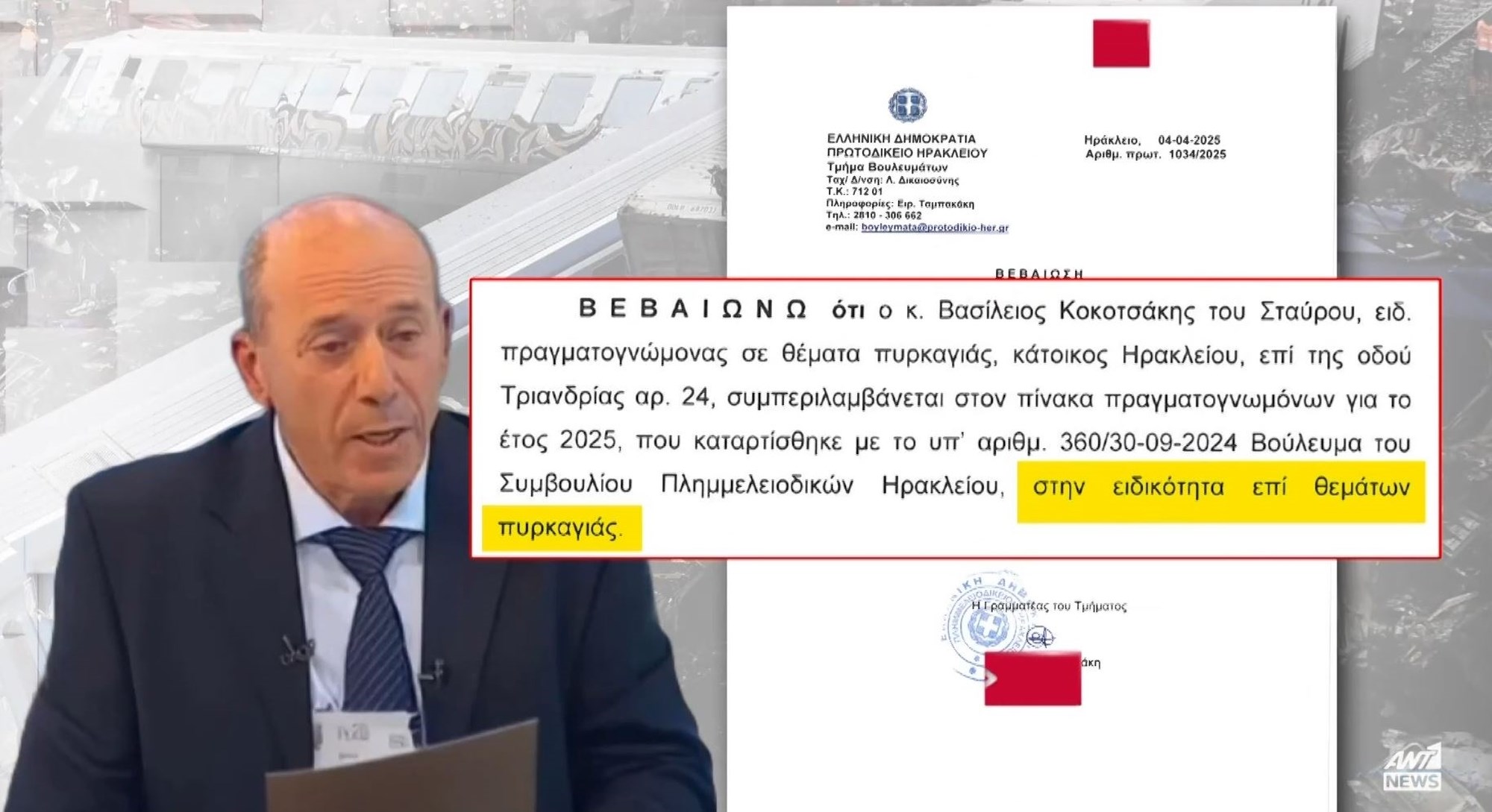 Βεβαίωση της Πυροσβεστικής Υπηρεσίας πιστοποιεί ότι ο Βασίλης Κοκοτσάκης είναι ειδικός σε θέματα πυρκαγιών. Είναι ο πραγματογνώμονας ο οποίος έχει καταλήξει στο συμπέρασμα ότι 27 επιβάτες επέζησαν από τη σύγκρουση αλλά πέθαναν από τη φωτιά.