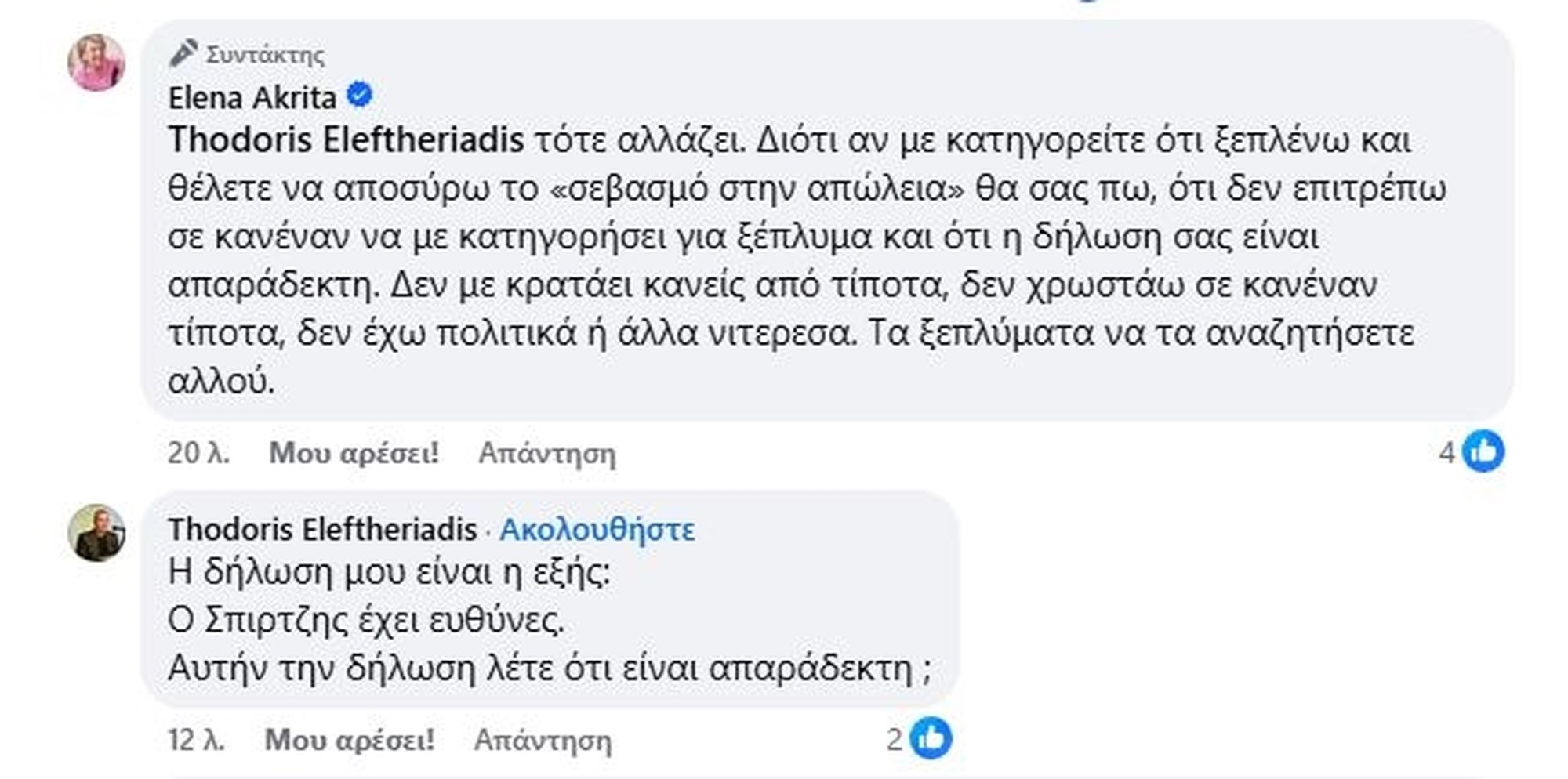 Από την πλευρά της η Έλενα Ακρίτα απάντησε: “Αν έχει ευθύνες να τις πληρώσει στο ακέραιο. Αλλά είναι ο μόνος που έχει ζητήσει άρση ασυλίας και ο μόνος που έκανε αίτημα για σύσταση ειδικής επιτροπής. Με κάθε σεβασμό στην απώλειά σας, στη ζωή μου και στην δημοσιογραφική πορεία μου 40 χρόνια δεν έχω ξεπλύνει ποτέ κανέναν και δεν σκοπεύω να αρχίσω τώρα”.