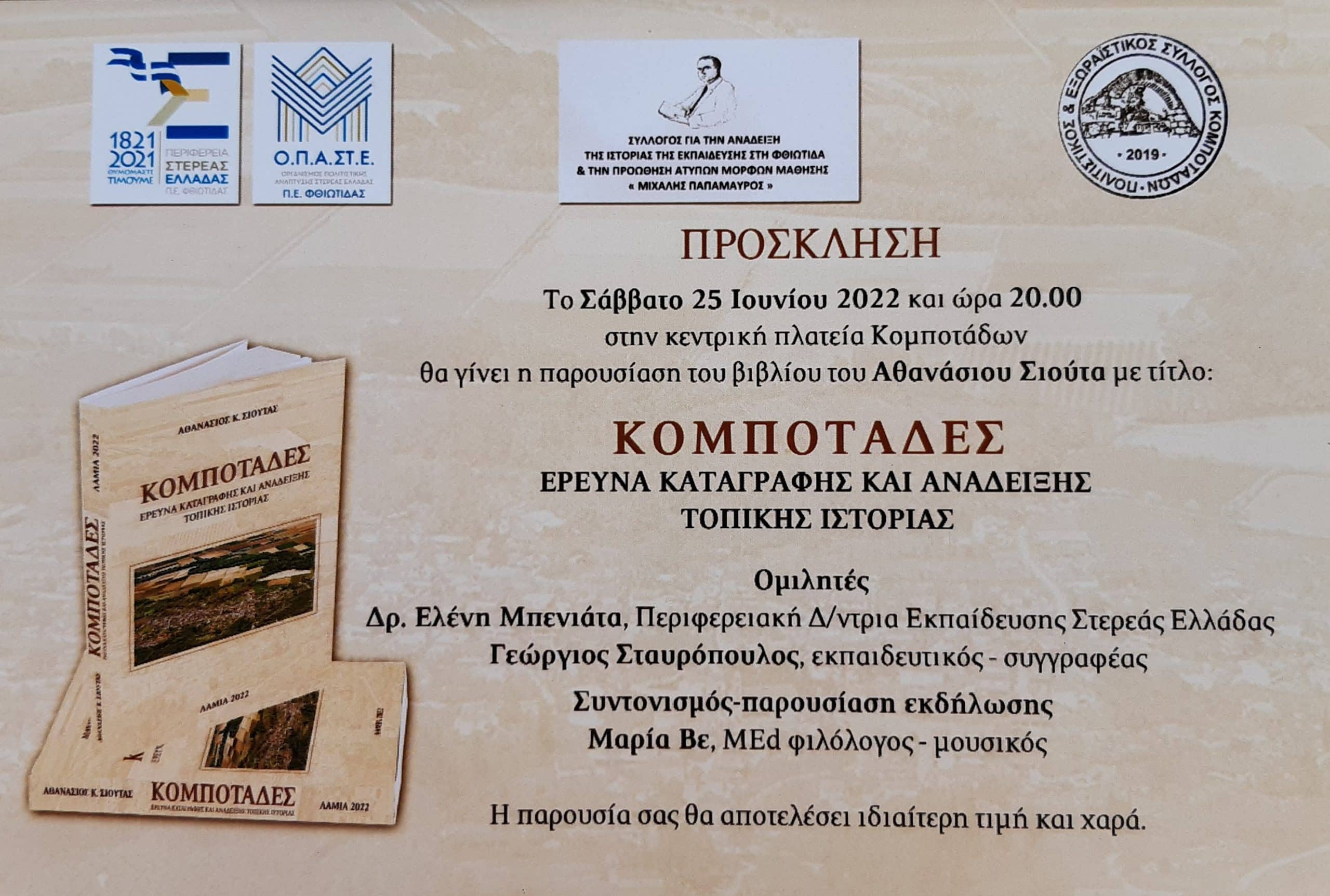 Τα Σάββατο 25 Ιουνίου και ώρα 20:00 στην Κεντρική Πλατεία Κομποτάδων θα γίνει η παρουσίαση του βιβλίου του Αθανασίου Σιούτα με τίτλο: