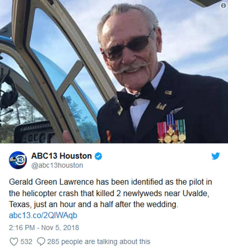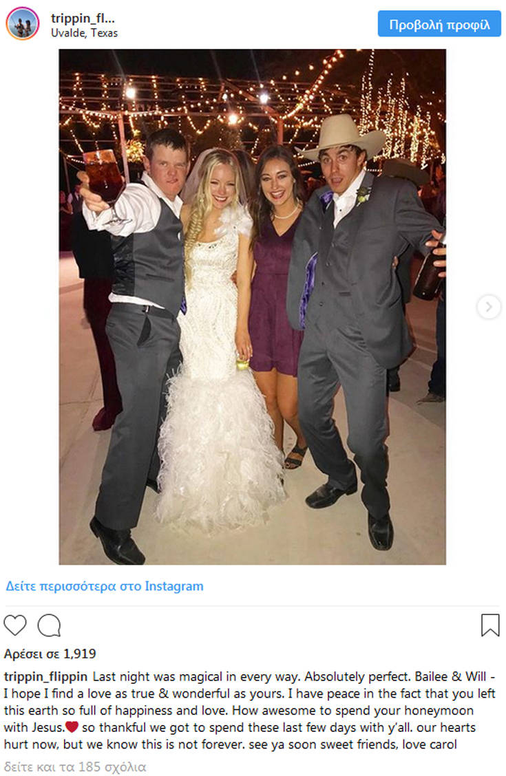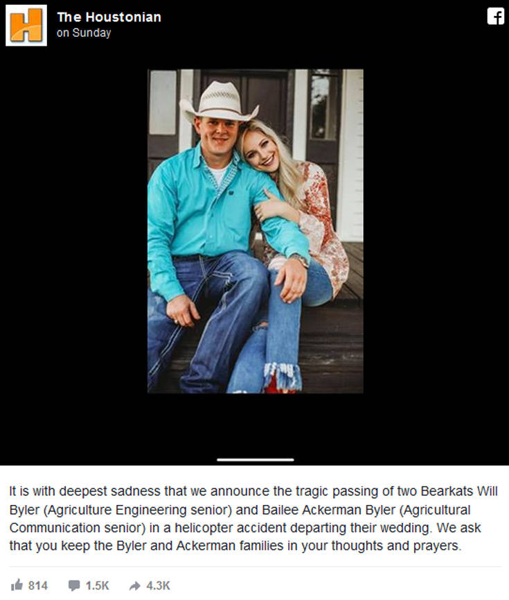 Αυτό συνέβη και σε ένα νεαρό ζευγάρι από το Τέξας. Οι Will Byler και Bailee Ackerman Byler έχασαν τη ζωή τους όταν συνετρίβη το ελικόπτερο, με το οποίο είχαν επιλέξει να φύγουν μαζί μόλις είχαν παντρευτεί, το Σάββατο το βράδυ.