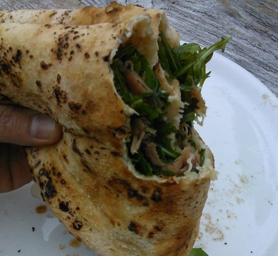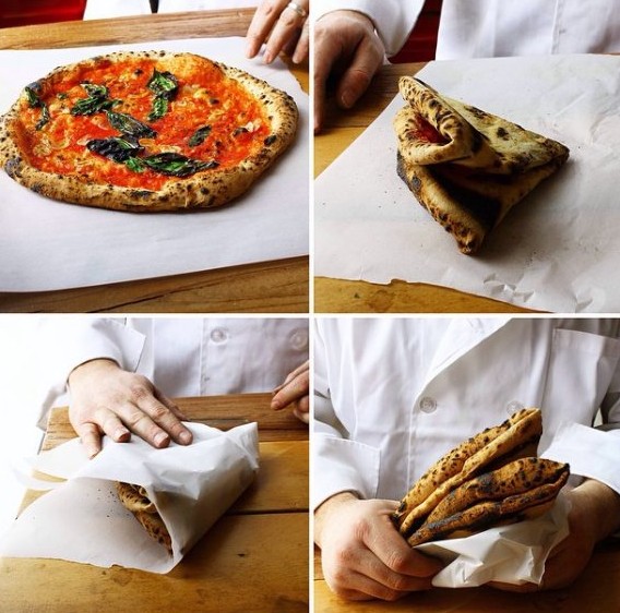 Ο βέλτιστος τρόπος να φάμε την πίτσα μας είναι να την διπλώσουμε σαν πορτοφόλι. Δίπλωσε την στα δύο και μετά φέρε τη μία άκρη στην άλλη. Αυτός είναι και ο τρόπος που σερβίρεται στους δρόμους της Νάπολη.