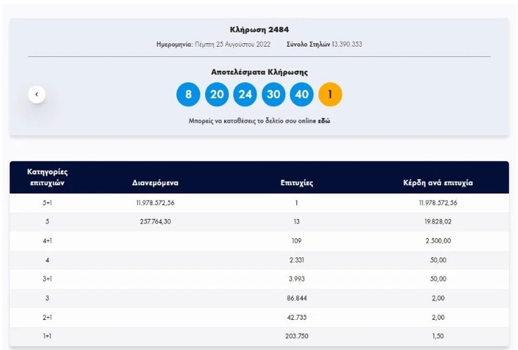 Ένα (1) τυχερό δελτίο βρέθηκε στην 1η κατηγορία (5+1) κατά τη σημερινή διαλογή της 2484ης κλήρωσης του ΤΖΟΚΕΡ που κερδίζει το ποσό των €11.978.572,56.