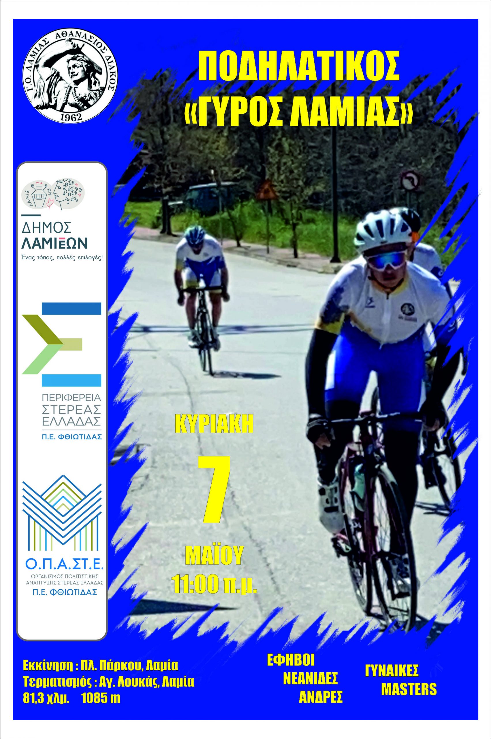 Ο Σωματείο Γ.Ο. Λαμίας «Αθαν. Διάκος» συνδιοργανώνει με το Δήμο Λαμιέων και τον Οργανισμό Πολιτιστικής Ανάπτυξης Στερεάς Ελλάδας (Π.Ε. Φθιώτιδας) τον διασυλλογικό αγώνα Ποδηλατικός Γύρος Λαμίας, την Κυριακή 7 Μαϊου 2023 ώρα 11:00.